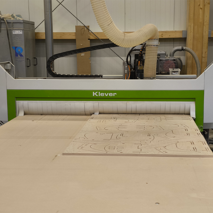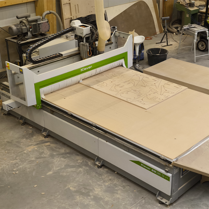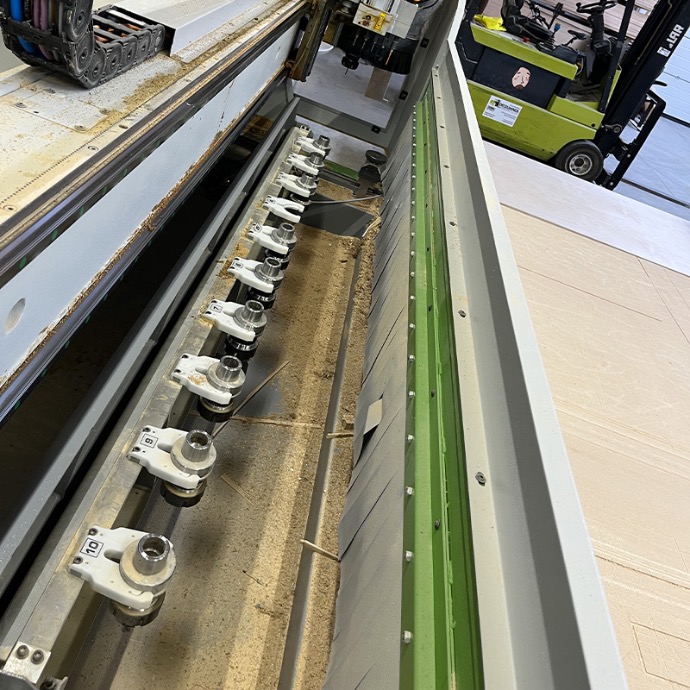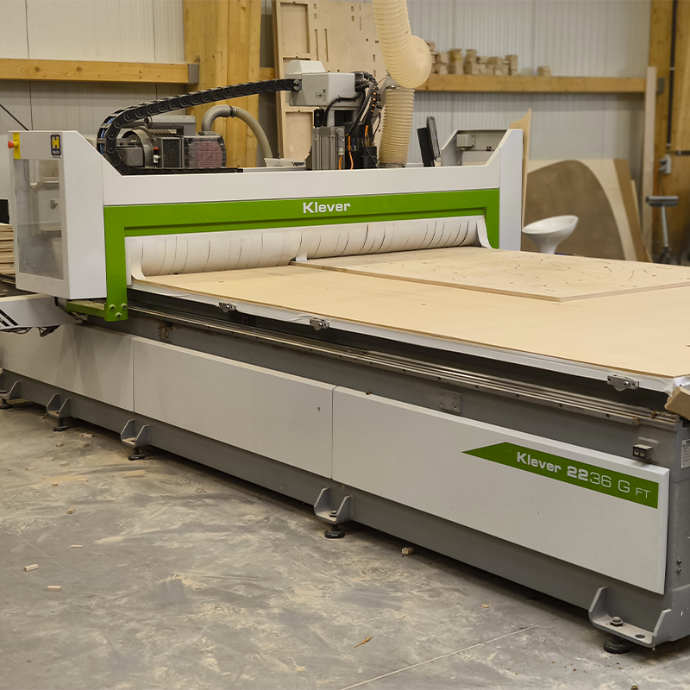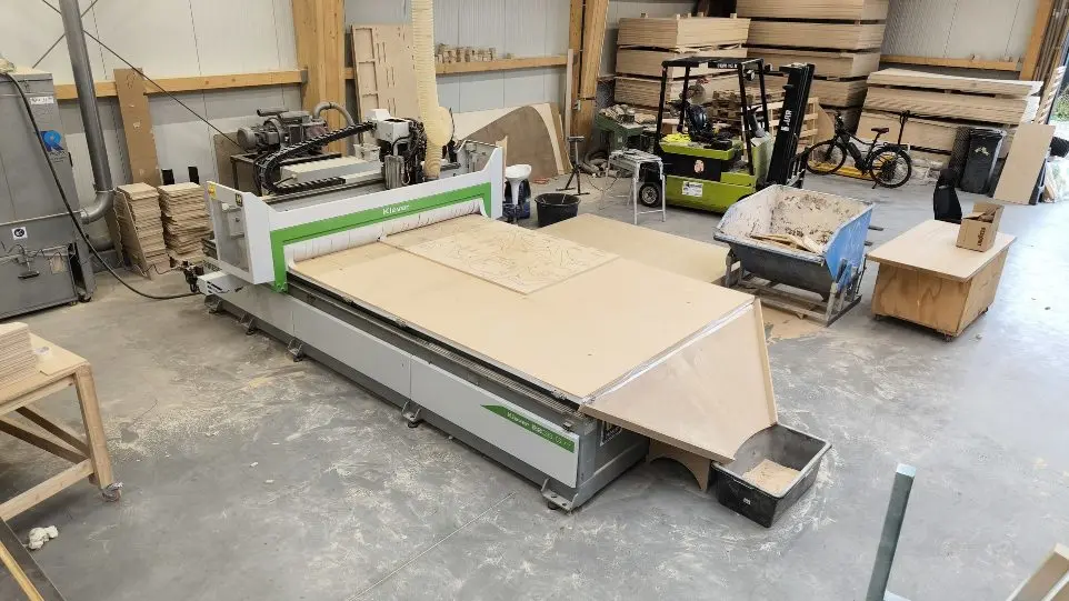 Capable de créer des pièces de menuiserie complexes avec une grand précision. La CNC Biesse Klever est une machine polyvalente qui peut gérer une large gamme de matériaux et de formes (bois, trespa, Plexiglas, aluminium), vous offrant ainsi une grande flexibilité dans vos projets de menuiserie aussi bien en panneaux qu'en bois massifs.